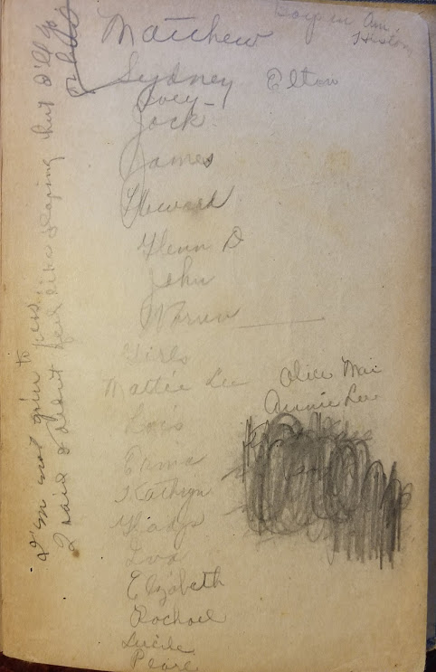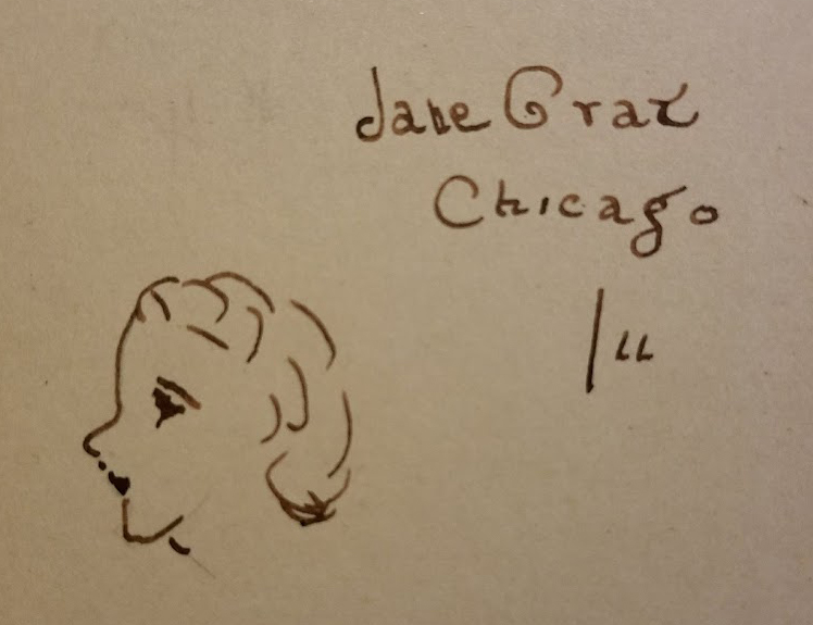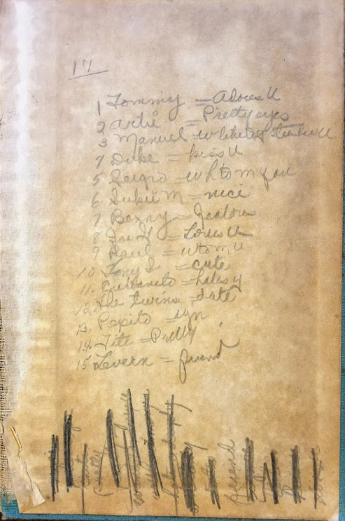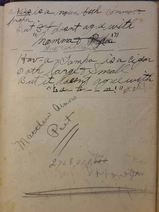 Some of the pages are a tangle of names, bits of gossip, dates, class notes and scribbles—sort of revealing but not easy to make out. There are cute poems, cryptic notes, and drawings of faces, a dress and a person smoking a rather large cigar. One would have to be a very astute detective to make something out of these bits of personal history.
