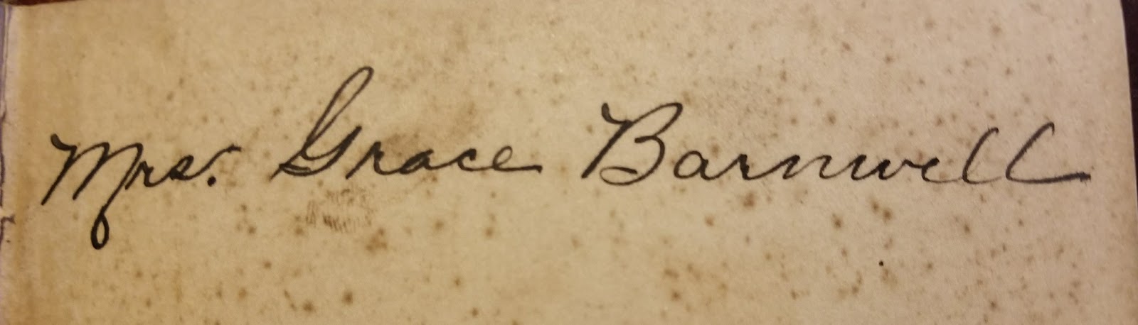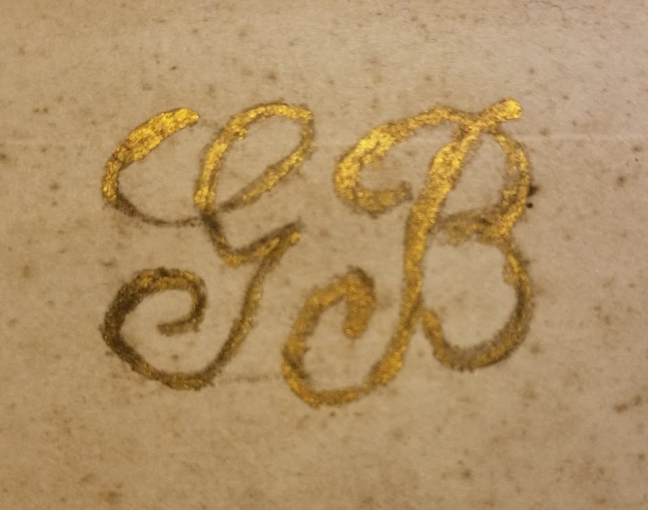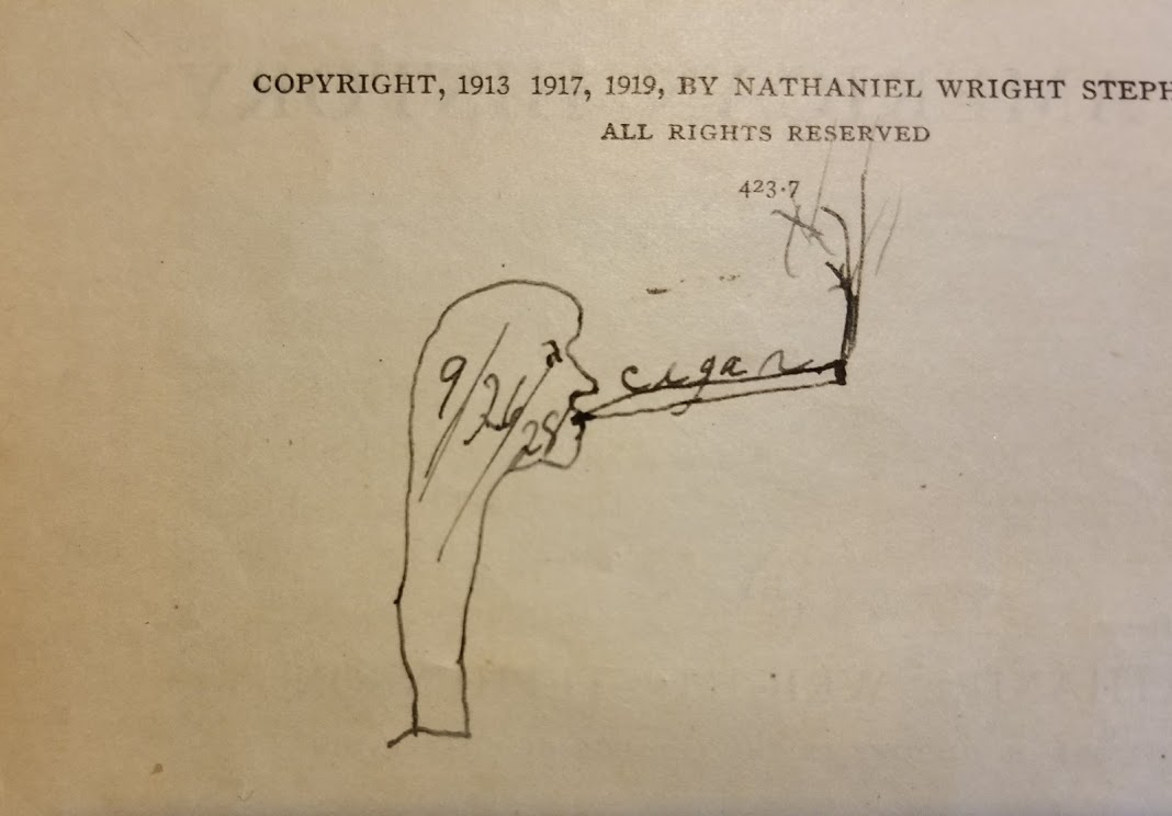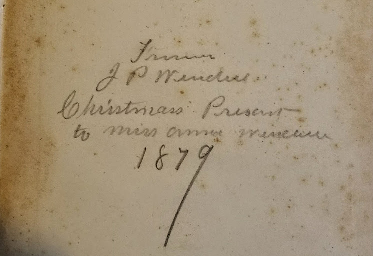 Most of the hand writing is quite mundane—the signatures of the books’ owners, sometimes with the date, the noting by a parent or husband of a gift for Christmas, and sometimes if I am lucky, a little sketch, or in the case of Grace Barnwell, an elegant monogram in gilt ink. There may be handwritten notes in textbooks about information to be remembered but more often younger writers left little drawings, self-consciously flowery signatures and in one case a list of names, presumably of classmates, with comments reflecting her feelings towards them—“pretty eyes”, “kiss u” and “loves u”. One can’t help wondering what happened in this person’s life. Did they go on to date one of these people on their list? Did they fall in love? I don’t think American History or Literature was much on their minds.
