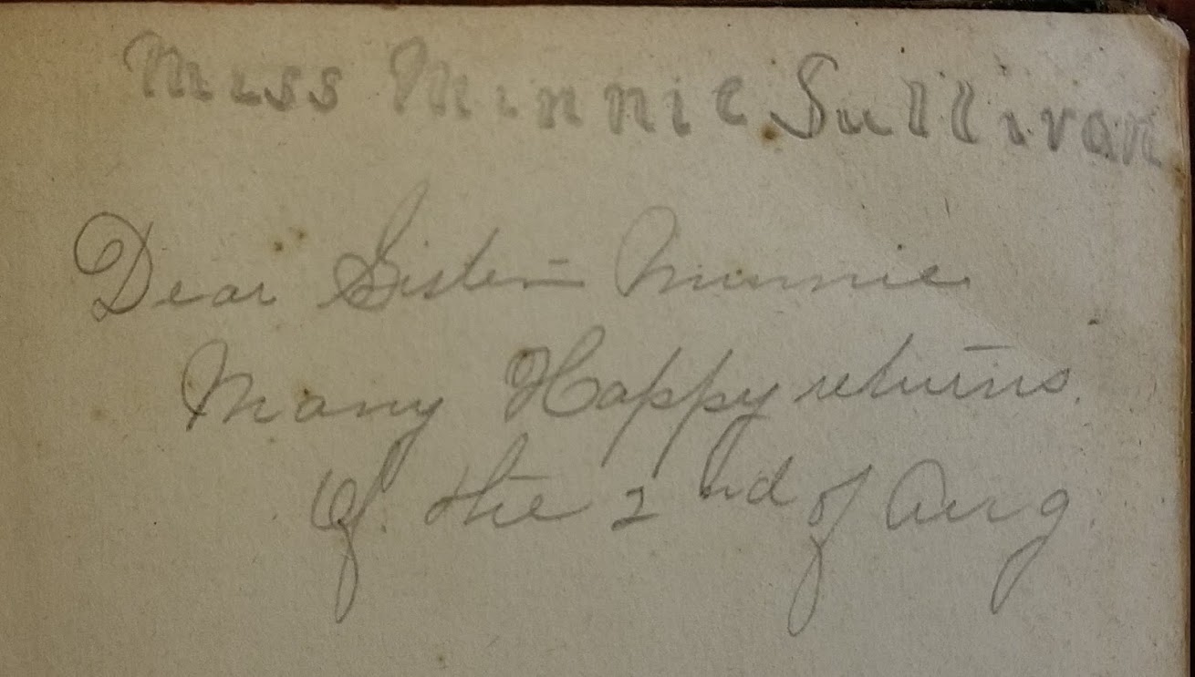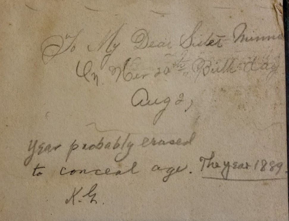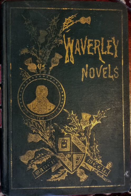 Family members would give each other books as gifts and often placed an inscription to the loved one on the flyleaf of the book. I came across a set of Sir Walter Scott’s Waverley novels from the mid-1800s in a used book store and bought them because I enjoy reading his historical tales of Scotland and England in the 12th to 18th centuries. When I opened the first volume I was pleased to see an inscription from Cassie Sullivan to her dearest sister, Minnie, on the occasion of her 20th birthday Aug. 2, 1889. That was the sort of personal touch that I take pleasure in and when I looked through the remaining six volumes I discovered that the industrious Cassie had put an inscription in each one! Minnie must have been a little shy about revealing her age because she erased the year on one inscription, but her naughty sister wrote it back in—1889—and chastised Minnie for erasing it. So, Minnie was born in 1869. I did a quick ancestry search in hopes of finding them but they remain a mystery. Sometimes that is better. I can picture them in lovely 19th century frocks sitting outdoors on a warm August day. Minnie is reading one of the Waverley novels to her sister, perhaps in a gazebo surrounded by flowers and trees.